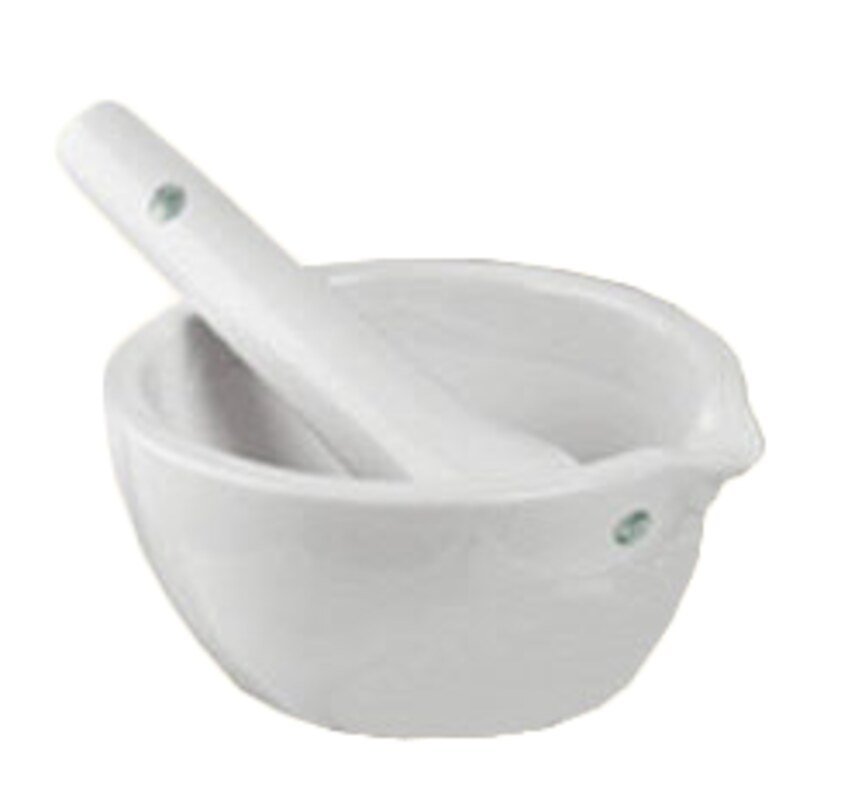 Mortiers et spatules pour la préparation et le traitement des poudres, des plantes et des préparations homéopathiques. En différents matériaux tels que la porcelaine, le verre ou l'agate.
