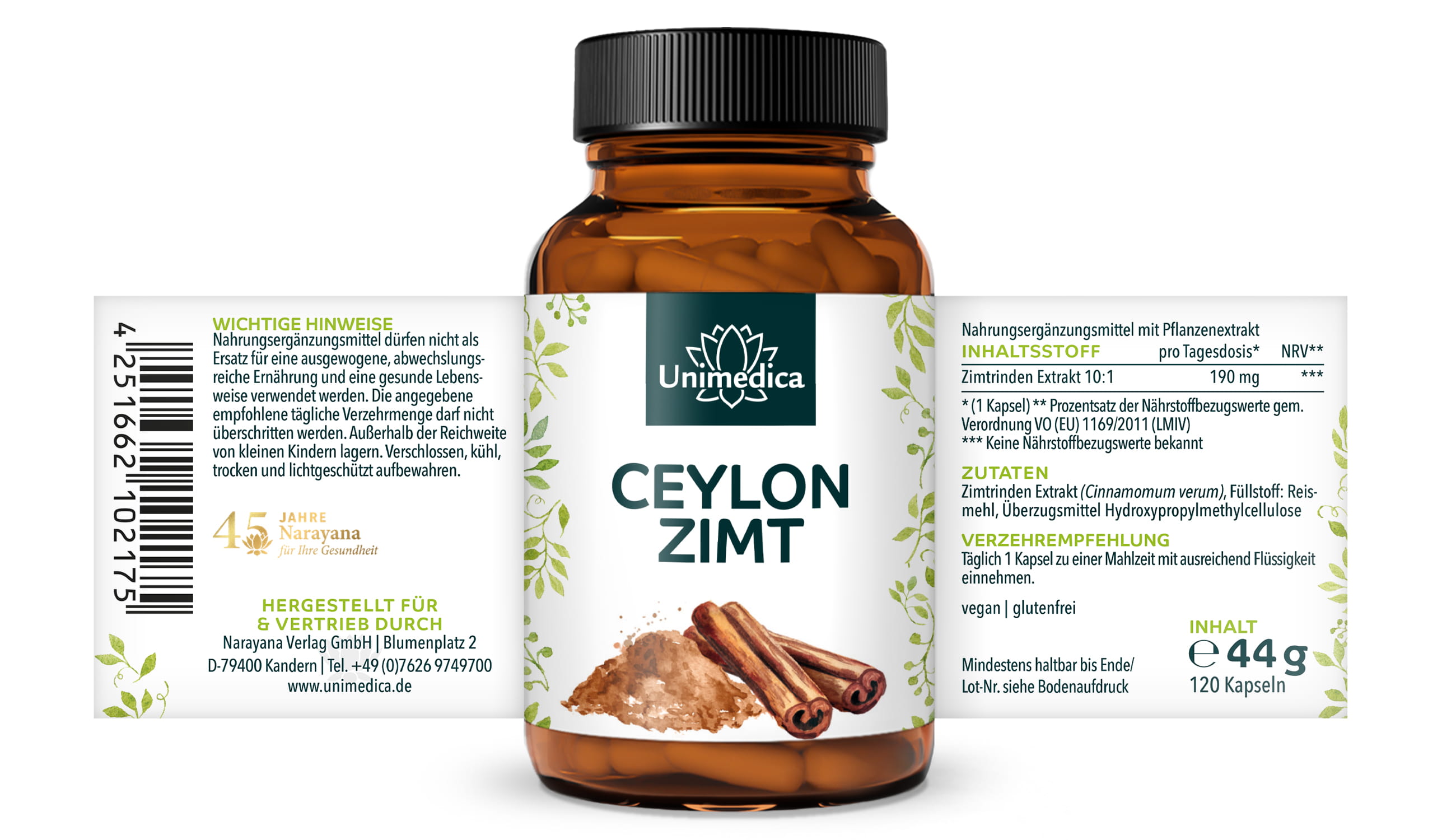 Chaque gélule d'extrait de cannelle de Ceylan d'Unimedica contient 190 mg d'extrait d'écorce de cannelle hautement concentré provenant du cannelier de Ceylan (Cinnamomum verum). Il s'agit de l'une des variétés de cannelle les plus nobles au monde. En effet, la cannelle de Ceylan se caractérise par sa faible teneur en coumarine par rapport aux autres variétés. Le contenu de la capsule correspond à 1 900 mg de cannelle pure.