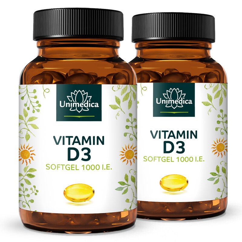 Les gélules molles de vitamine D3 d'Unimedica fournissent quotidiennement et de façon commode à l'organisme la vitamine D (cholécalciférol), indispensable à l'organisme, indépendamment du rayonnement solaire et de l'apport nutritionnel des aliments. Avec 1 000 UI (unités internationales) de vitamine D3 par dose journalière, un bon apport de base est garanti. Cette dose correspond à 500 % de la quantité quotidienne recommandée pour contribuer au maintien d'une ossature, d'une dentition et d'une fonction musculaire normales, au fonctionnement normal du système immunitaire, à l'absorption normale du calcium et à une calcémie normale, ce qui essentiel pour la structure osseuse.