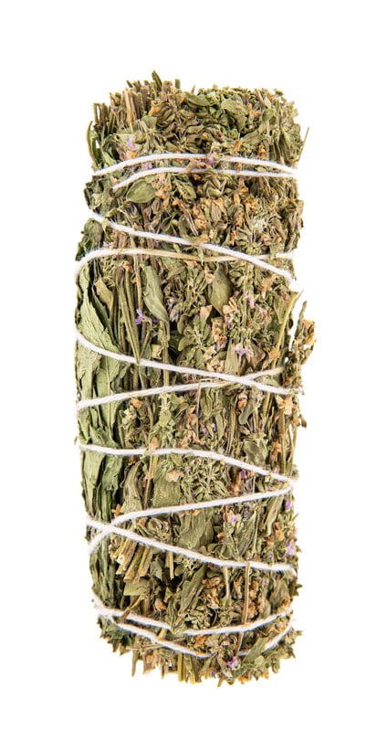 Botte d'encens composée des trois herbes thym, menthe poivrée et romarin. Longueur : 10 cm. Issu de l'agriculture biologique contrôlée.