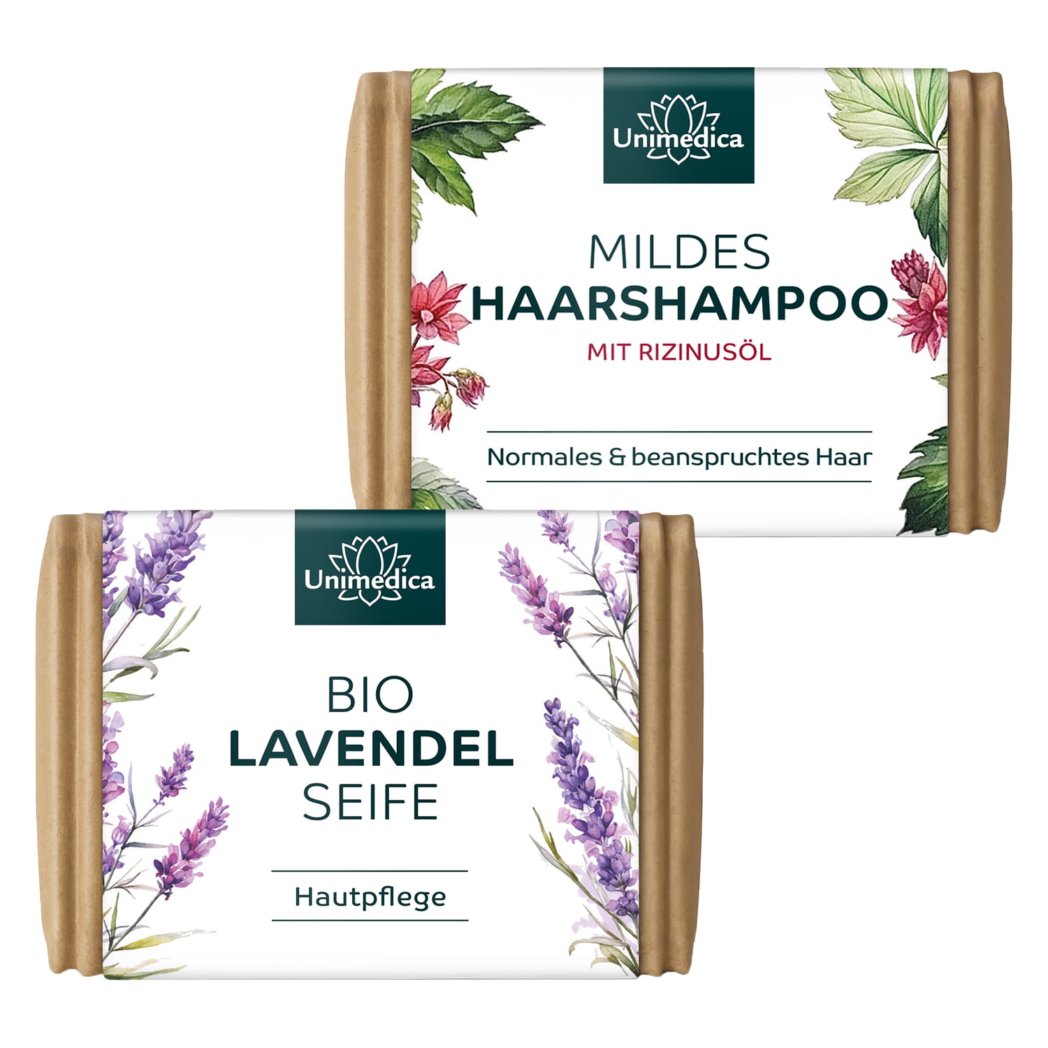 Pack économique : Savon bio à la lavande 100 g & Shampoing doux pour cheveux 100 g - par Unimedica