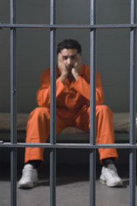 Full length of a depressed criminal sitting behind bars © bikeriderlondon