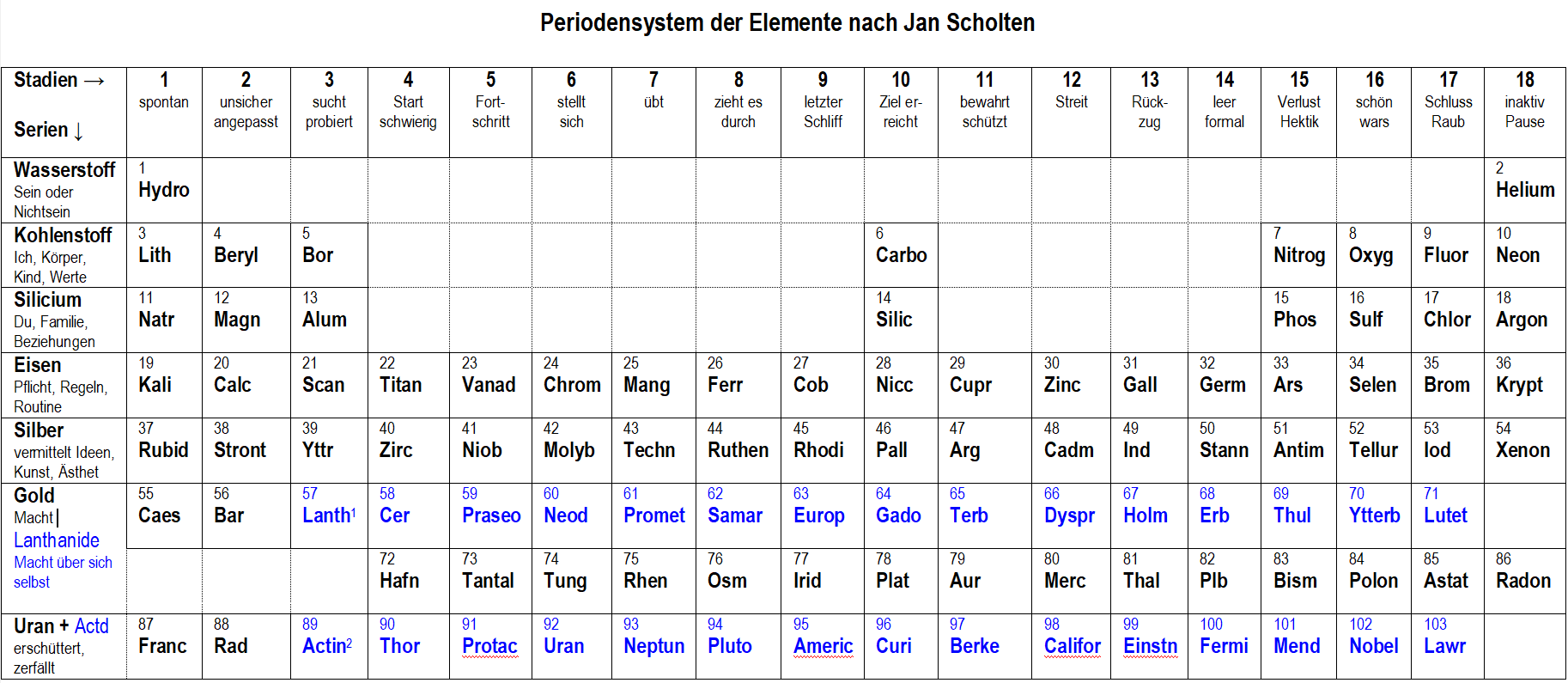 Die Eigenschaften jedes Elements ergeben sich aus seiner Position im Periodensystem: Die sieben Reihen und 18 Spalten des Periodensystems wurden von Scholten „Serien“ und „Stadien“ genannt. Es gibt also sieben Serien und 18 Stadien. Die Serien sind die Ebenen der geistigen und körper­lichen Entwicklungsstufe vom Kind bis zum Greisenalter, und die Stadien sind die Schritte, in denen diese Ebenen durchlaufen werden: vom spontanen Beginn (1) über lernenden Aufstieg (2-9) und Erfolg (10, 11) bis zum folgenden Niedergang (12-17), in dem man lernt, wie man das Erworbene wieder loslässt und nicht an ihm hängt. So ist die „Kohlenstoffserie“ die zweite Reihe, die Serie der kindlichen Erfah­rungen. Sie enthält Elemente wie Kohlenstoff, Stickstoff und Sauerstoff, also die grundlegenden Baustoffe des Körpers. Sie sind auch in der alten Homöopathie bekannt als Elemente körperlicher Vitalfunktionen. Carbo vegetabilis, die potenzierte Pflanzenkohle, ist ein guter Atem-Booster bei mangelnder Sauerstoffversorgung. Erst seit wenigen Jahren ist Stickstoff und Sauerstoff als kombiniertes Molekül NO als gefäß­erweiternde physio­logische Substanz in der Kreislaufregulation bekannt geworden, doch es war vorher schon als Nitro­genium oxydatum in der Homöopathie eingesetzt worden und kann in seinen Indikationen der Gefäß­erweiterung nach der Theorie der Elemente abgeleitet werden.