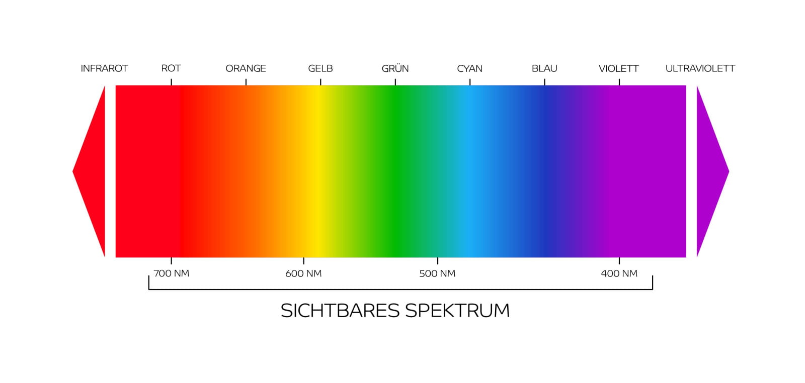 Das Lichtspektrum umfasst verschiedene Wellenlängen, die sich zwischen ultraviolettem Licht und dem Infrarotbereich aufspannen. Das menschliche Auge kann Wellenlängen zwischen 380 und 780 nm erfassen.