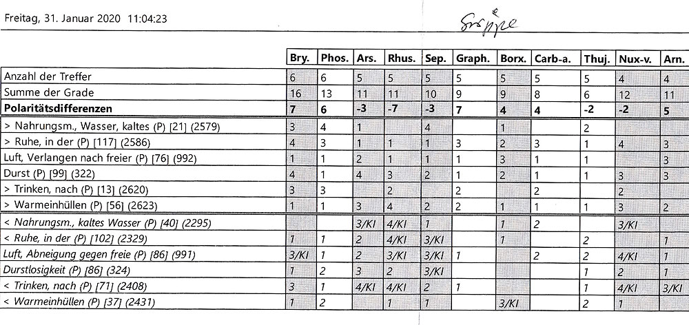 Polaritätsanalyse nach Bönninghausen/Frei: die Kontraindikation von Bry (grau unterlegt) führte zur Gabe von Phos, doch hier dürfte sie in die Irre geführt haben: Die Patientin hat normalerweise ein sehr starkes Verlangen nach frischer Luft, sie wurde aber nicht gefragt, ob das auch im Akutfall zutrifft und hat vermutlich ihre sonst stark ausgeprägte Modalität genannt.