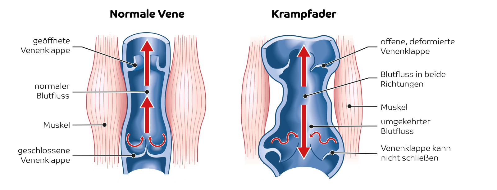 Abbildung: Bildliche Darstellung einer gesunden Vene und einer Krampfader.